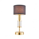 Настольная лампа декоративная стиля модерн для гостиной, кабинета или спальни имеет размеры 140x330 мм. Арматура светильника окрашена в золотой цвет. Лампы в комплекте - отсутствуют. В светильнике применяются лампы накаливания или светодиодная LED-лампа. Цвет плафонов - черный, неокрашенный, с матовой, прозрачной поверхностью. Материал плафонов - текстиль, стекло. Класс электробезопасности - II, степень пылевлагозащиты (IP) - 20. Максимальная мощность лампы (Вт) - 40. Светильник размещается на столе.